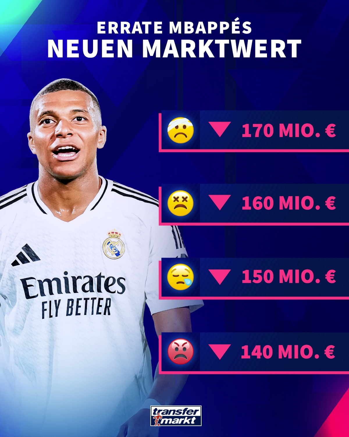 德转在预热图中给出了1.7亿欧、1.6亿欧、1.5亿欧和1.4亿欧四个数字,意味着姆巴佩目前1.8亿欧的身价将下跌1000万-4000万欧。