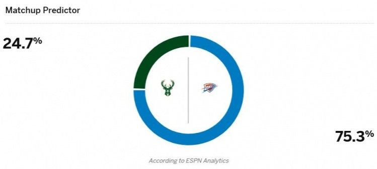 赛前,ESPN预测了本场比赛双方胜率:雷霆75.3%,雄鹿24.7%。