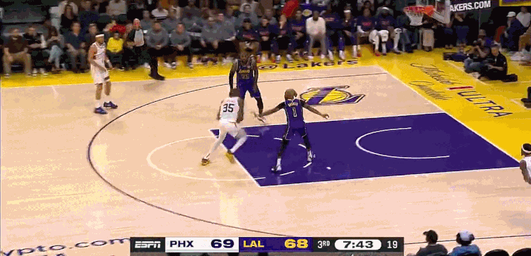 末节比赛,詹姆斯翻身跳投率先得分,杜兰特两罚全中,八村塁杀内线暴扣,里夫斯命中三分,湖人领先7分。太阳的进攻陷入麻烦,在3分钟内没有运动战得分,海斯篮下打进,分差来到两位数。琼斯抛投终于得分,两队得分交替上升,湖人一直保持10分左右领先,拉塞尔命中三分,湖人领先12分打停太阳。暂停回来,琼斯两罚全中止血,浓眉篮下打进回应。双方分差在10分左右徘徊,太阳始终没能扭转局面,随着时间流逝,比赛逐渐失去悬念。