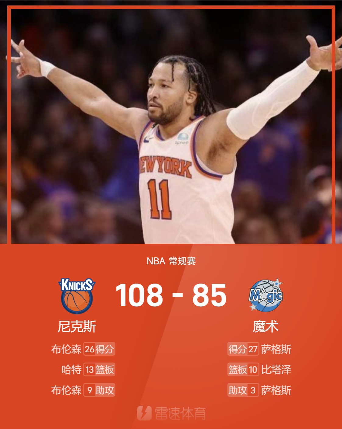 1.尼克斯108-85魔术:布伦森26分9助攻2抢断