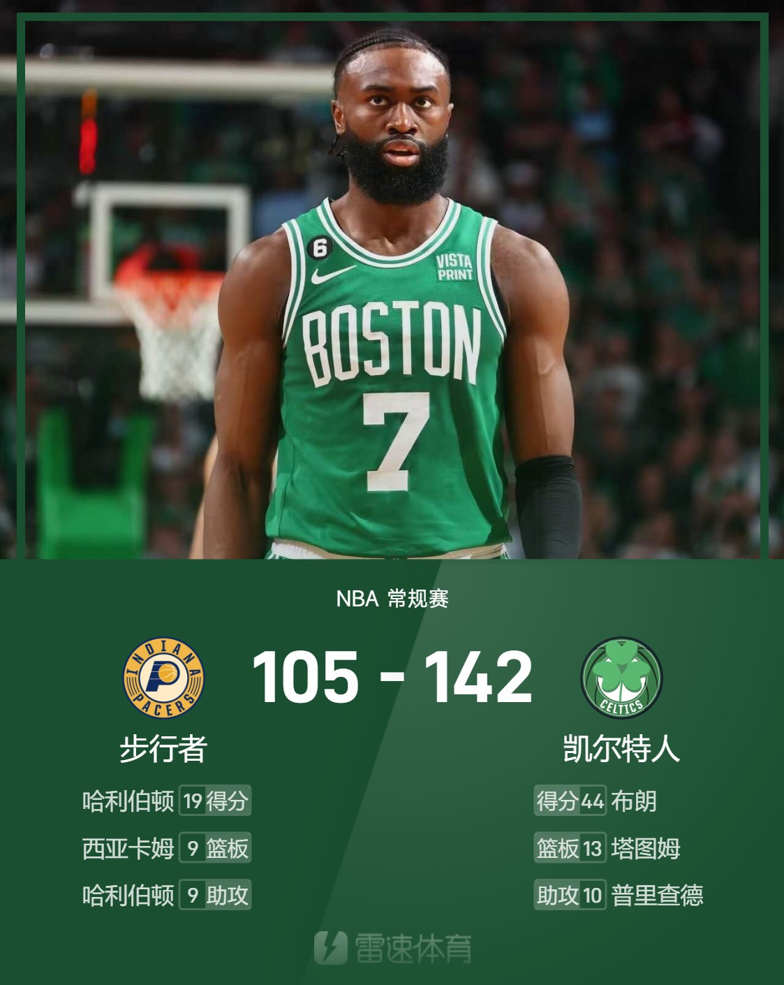 2.步行者105-142凯尔特人:布朗44分5篮板3助攻助攻4抢断。
