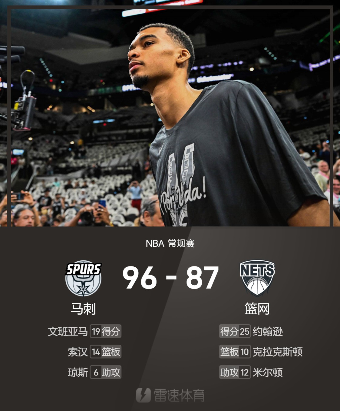 3.马刺96-87篮网:文班亚马19分7篮板4助攻6盖帽