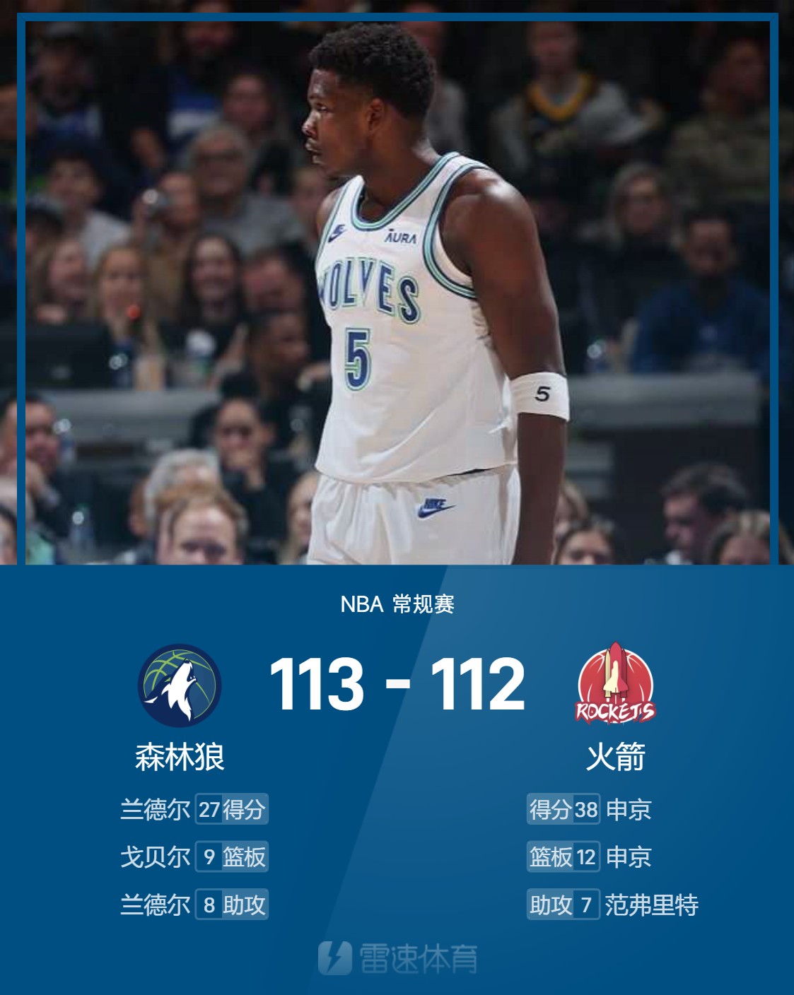 4.森林狼113-112火箭:爱德华兹24分5篮板&三分准绝杀,申京38分12篮板