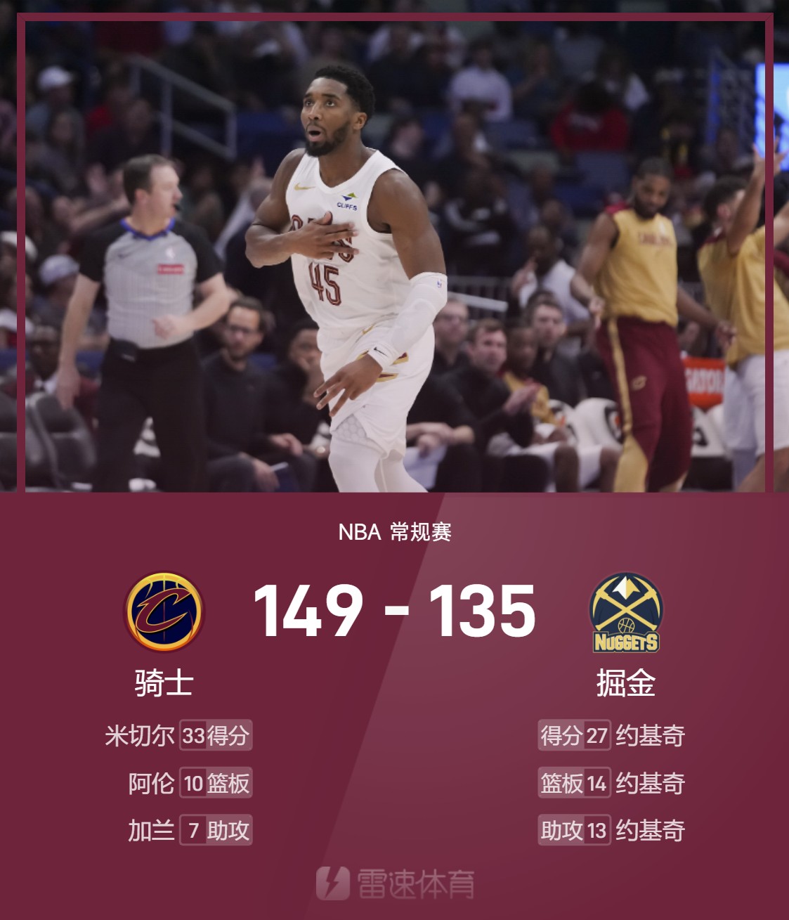 6.骑士149-135掘金:米切尔33分,约基奇27分14篮板13助攻