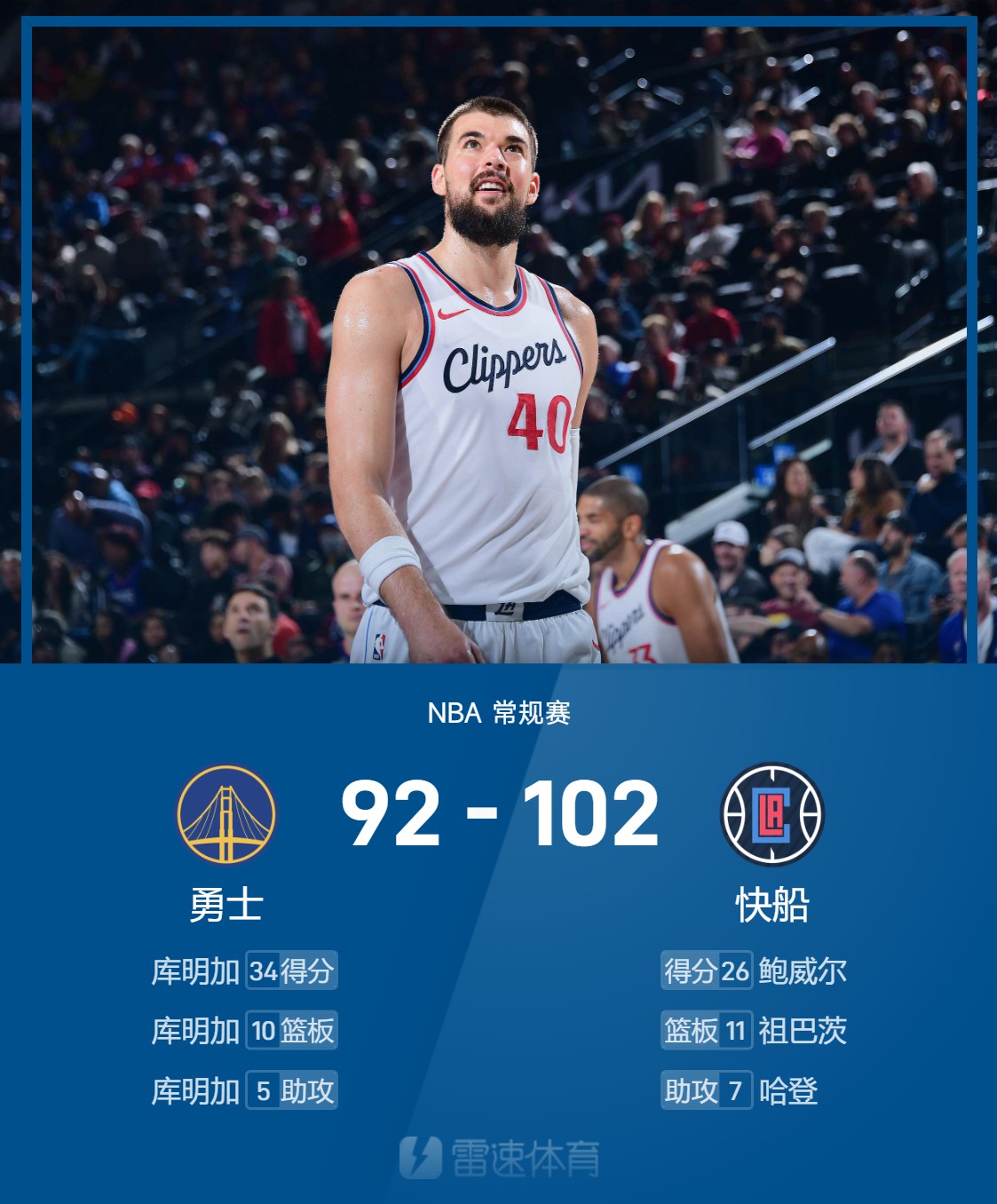 8.快船102-92勇士:祖巴茨17分11篮板5盖帽,库明加34分10篮板5助攻