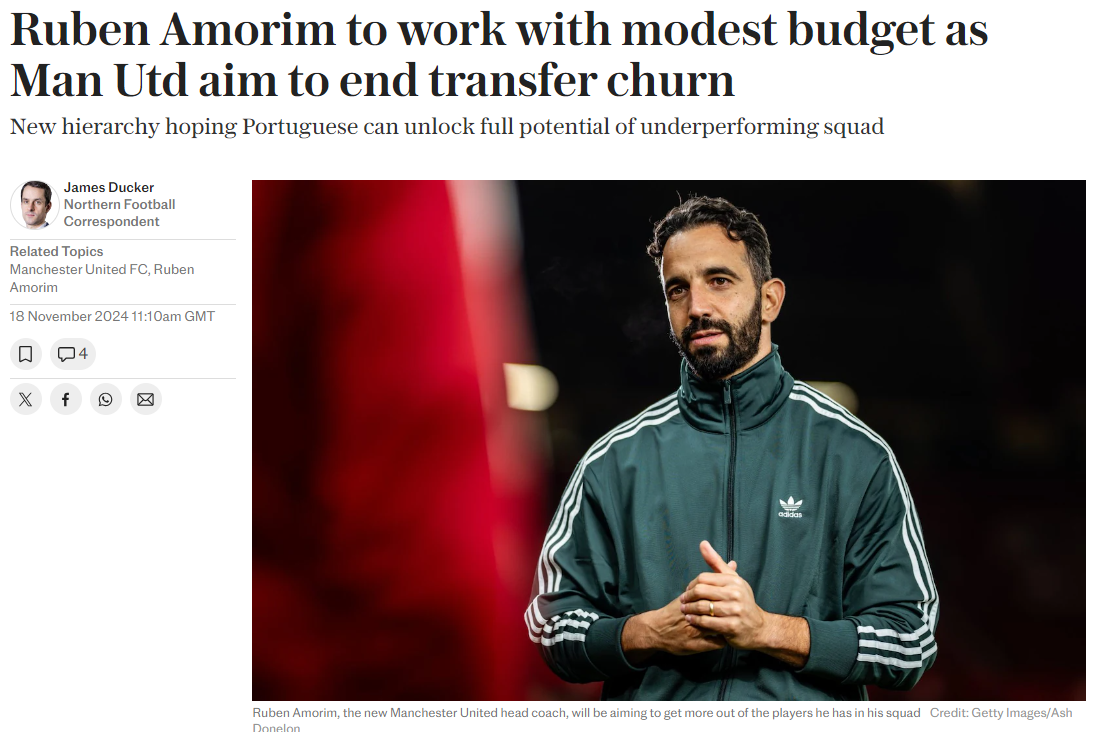 雷速体育11月18日讯 根据英国媒体《电讯报》的报道,曼联新帅阿莫林上任之后,红魔过往烧钱的模式将被废除,俱乐部希望阿莫林能充分挖掘球队的潜能从而提升成绩,冬窗也不可能有太大动作。