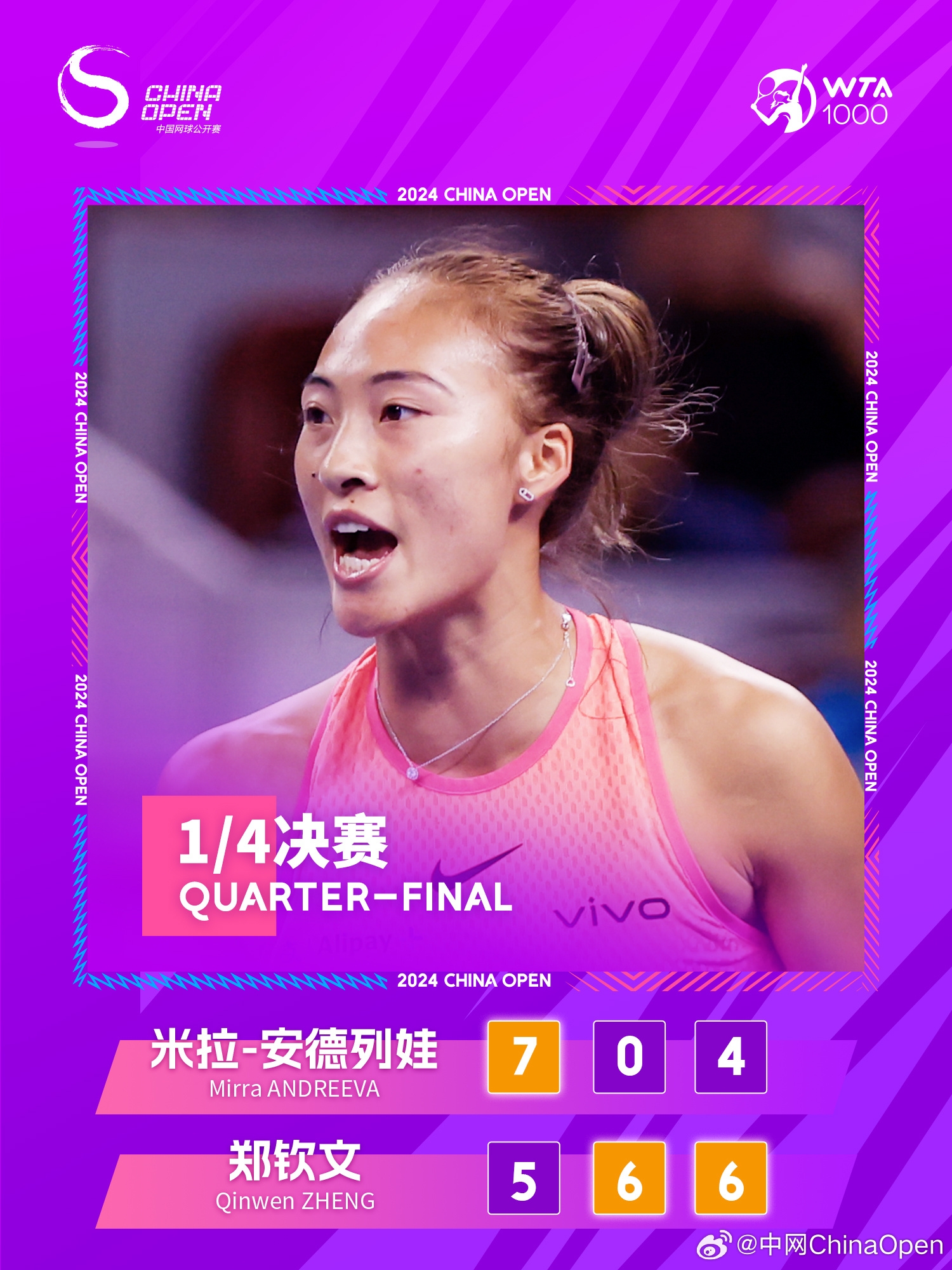 10月4日讯中网女单1/4决赛,郑钦文2-1逆转安德烈耶娃,晋级4强。郑钦文半决赛对阵穆霍娃。