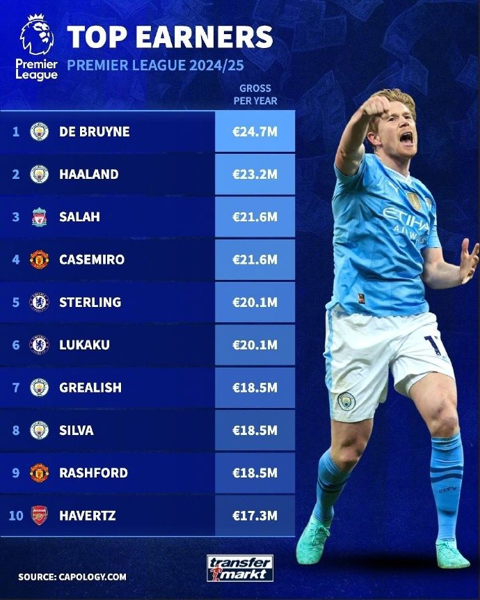 首先,货币单位是欧元。另外,列出的收入是“总收入”,通常称为“税前工资”,并不是纳税后可以获得的净收入。排名第一的是英超比利时球星德布劳内,年薪2470万欧元。排名第二的是他在伊蒂哈德球场的队友、挪威前锋哈兰德,身价为2320万欧元。